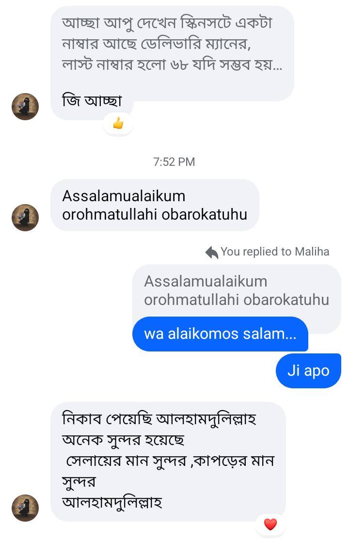 নিকাবটি ৫ পার্টের, অনেক বড়সড়, পুরো পেট-পিঠ ঢেকে থাকবে। খুব সফ্ট মোলায়েম অরিজিনাল চায়না শিপন জর্জেট কাপড় ব্যবহার করা হয়েছে। ওজনে খুব হালকা, সারাদিন পরে থাকলেও ভারি ও বিরক্তিকর মনে হবে না। চোখের সেটিংটাও খুব নিখুঁত ও সুন্দর।