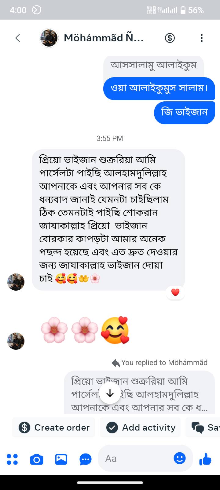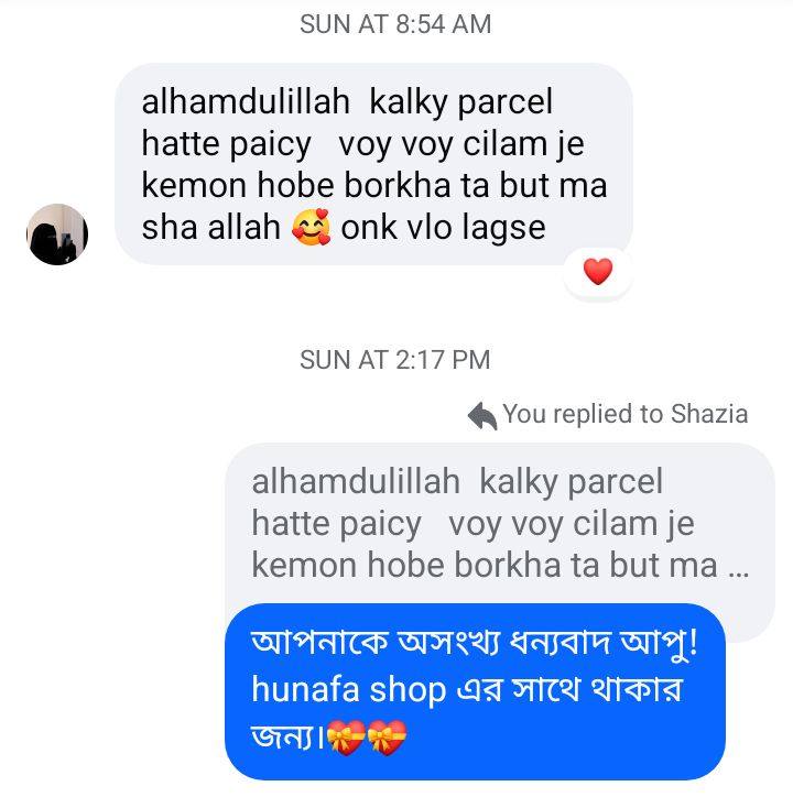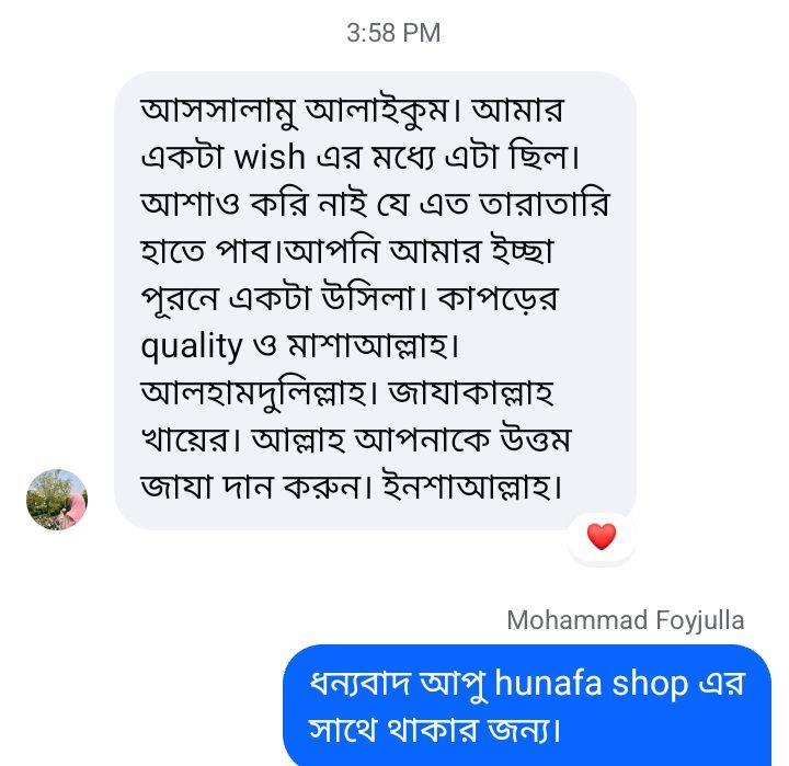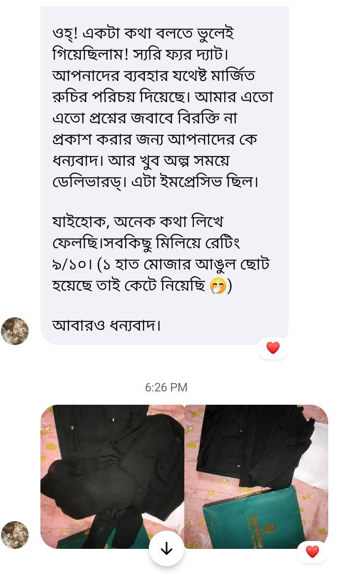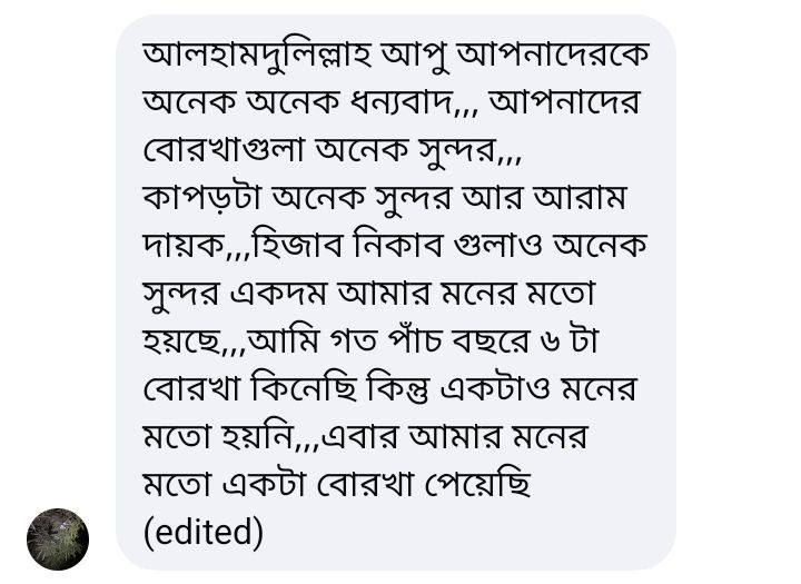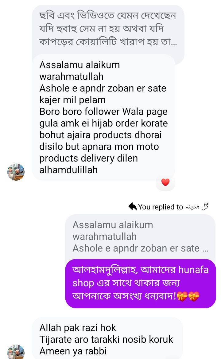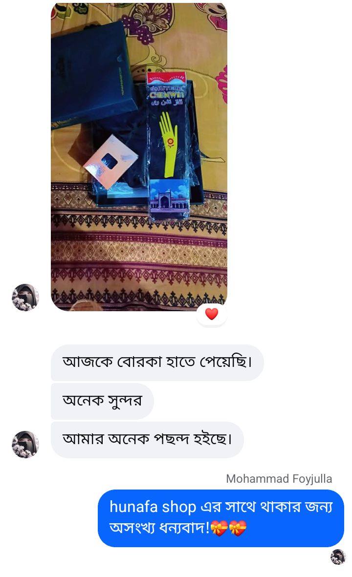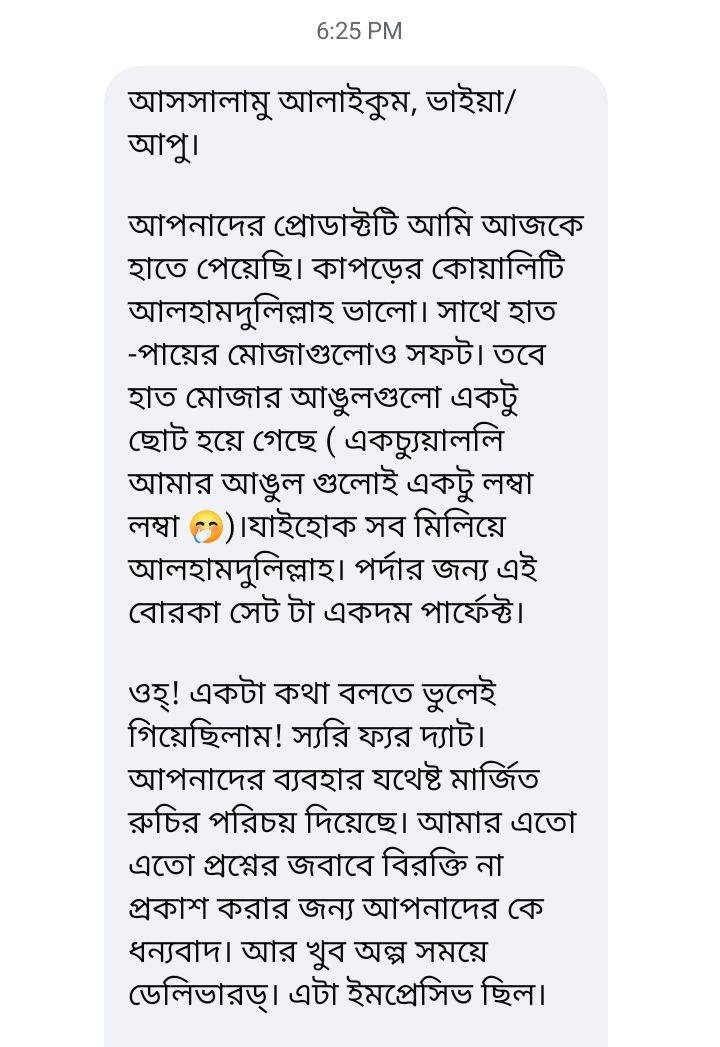আমাদের বোরকার প্যাকেজটিতে উন্নতমানের ব্লাক চেরী কাপড় ও অরিজিনাল চায়না শিপন জর্জেট কাপড় ব্যবহার করা হয়েছে, যা খুবই সফ্ট। সেলাই ও ফিটিং অনেক সুন্দর। আমরা সরাসরি কারখানা থেকে দক্ষ কারিগর দ্বারা খুব যত্নের সহিত বানিয়ে থাকি আলহামদুলিল্লাহ।