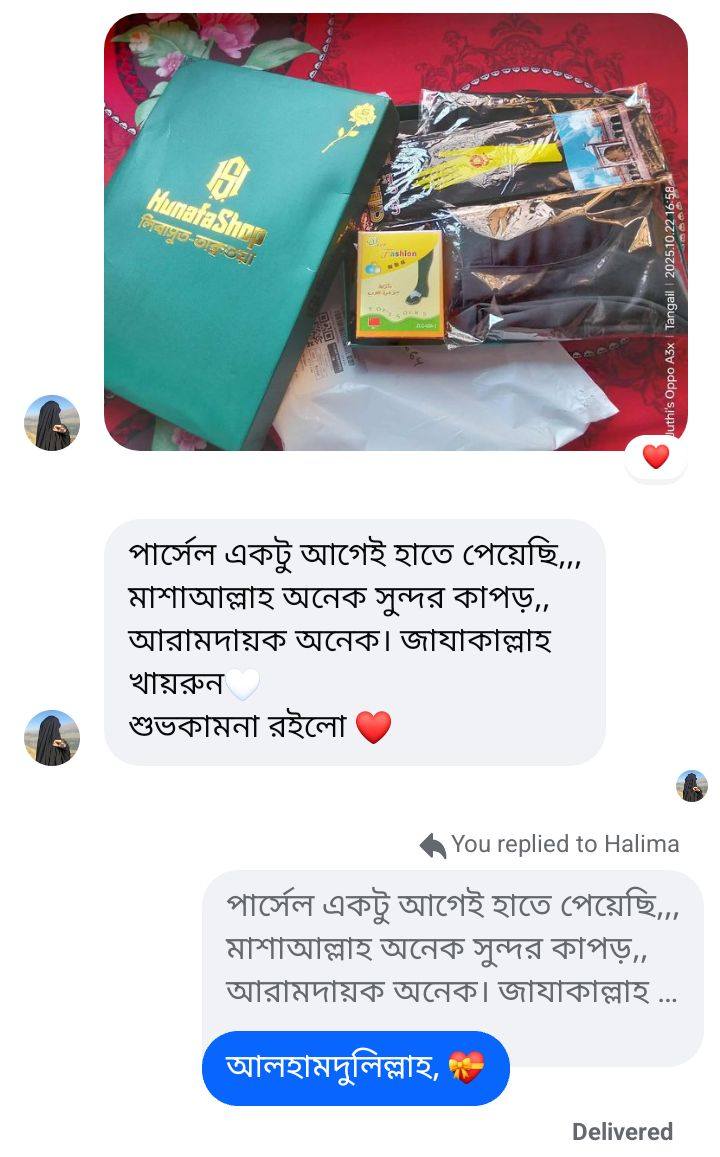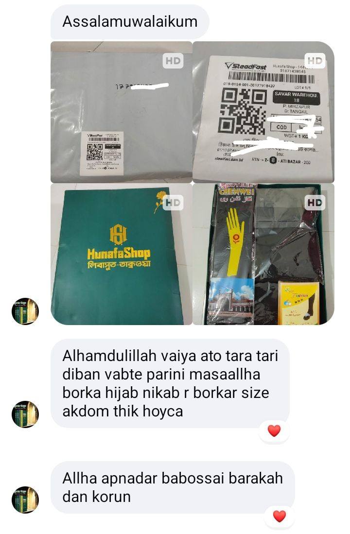 আমাদের এই “লিবাসুত-তাক্বওয়া-v1” বোরকার কম্বো প্যাকেজটি আপনার হাতে পৌঁছে দিচ্ছি। দেশের যে কোনো প্রান্ত থেকে অর্ডার করে সহজেই প্যাকেজটি সংগ্ৰহ করতে পারেন ইনশাআল্লাহ।
